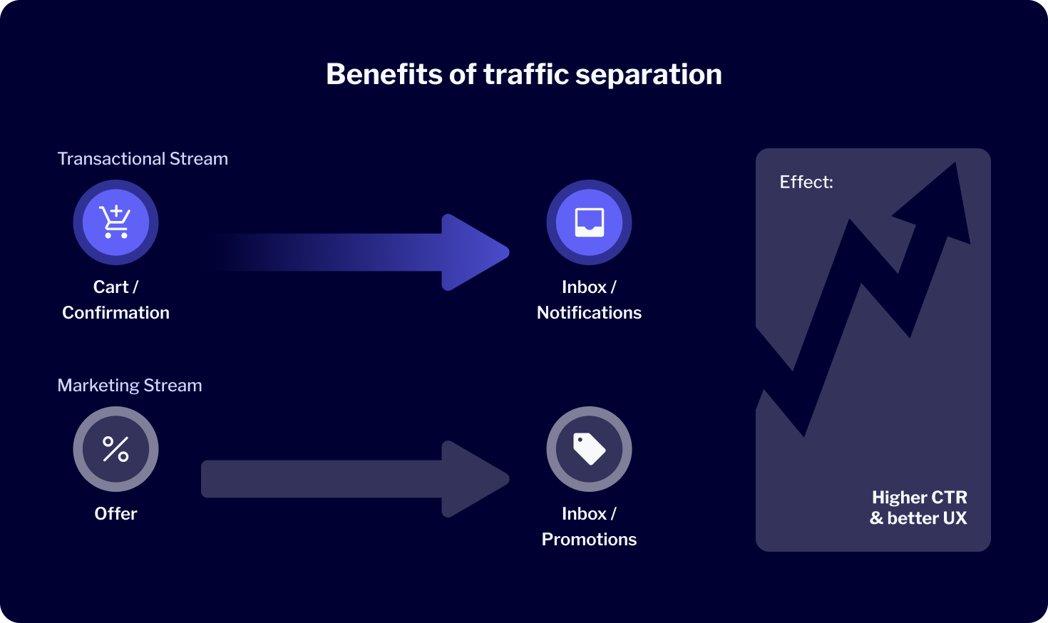 Separate IP Pools for Precise Classification: As part of the authorization, we allocate dedicated, separate IP pools for marketing and transactional traffic. This is crucial because both communication types have different characteristics. This allows mailbox providers to precisely classify your messages: transactional emails go to the primary inbox or “Notifications” tab, while marketing communications are directed to tabs like “Promotions.”