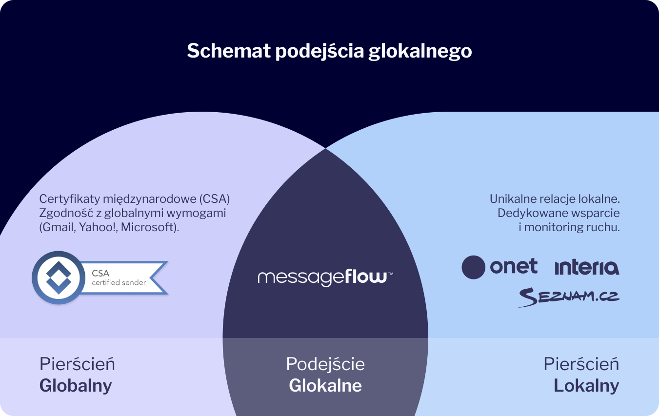 Właśnie to wyróżnia platformę MessageFlow. Dbamy, by Twoje wiadomości spełniały międzynarodowe standardy, a jednocześnie były w pełni dostosowane do wymagań lokalnych operatorów poczty. W praktyce oznacza to, że oprócz certyfikatów, takich jak CSA, wypracowaliśmy również unikalne relacje z kluczowymi polskimi dostawcami – Onetem, Interią i Wirtualną Polską – oraz uwzględniamy wymagania innych europejskich providerów, np. czeskich, francuskich czy włoskich.