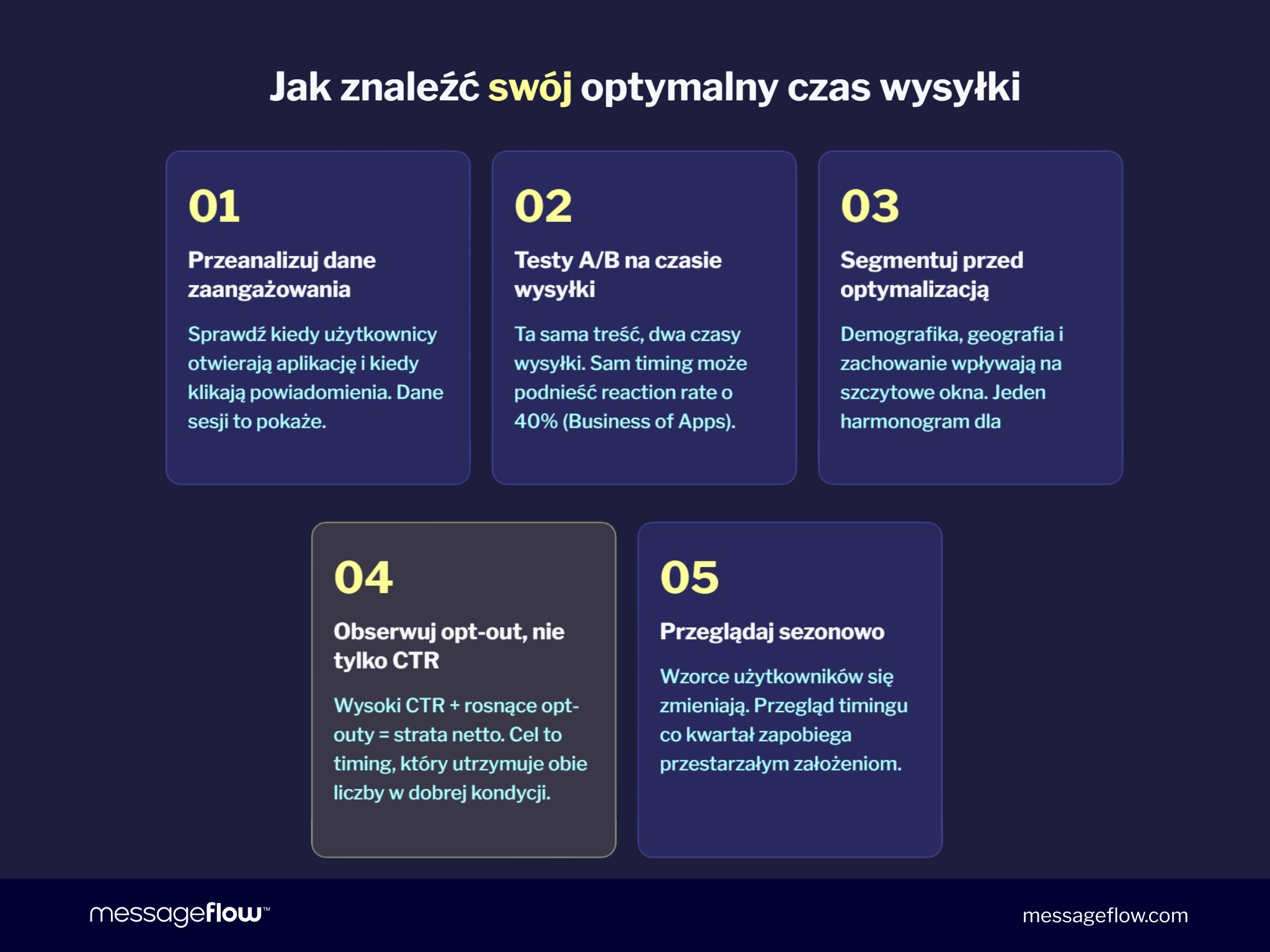 4. Obserwuj opt-out rate, nie tylko CTR Czas wysyłki generujący wysoki CTR, ale podnoszący opt-outy to strata netto. Chodzi o czas, który utrzymuje obie liczby w dobrej kondycji.