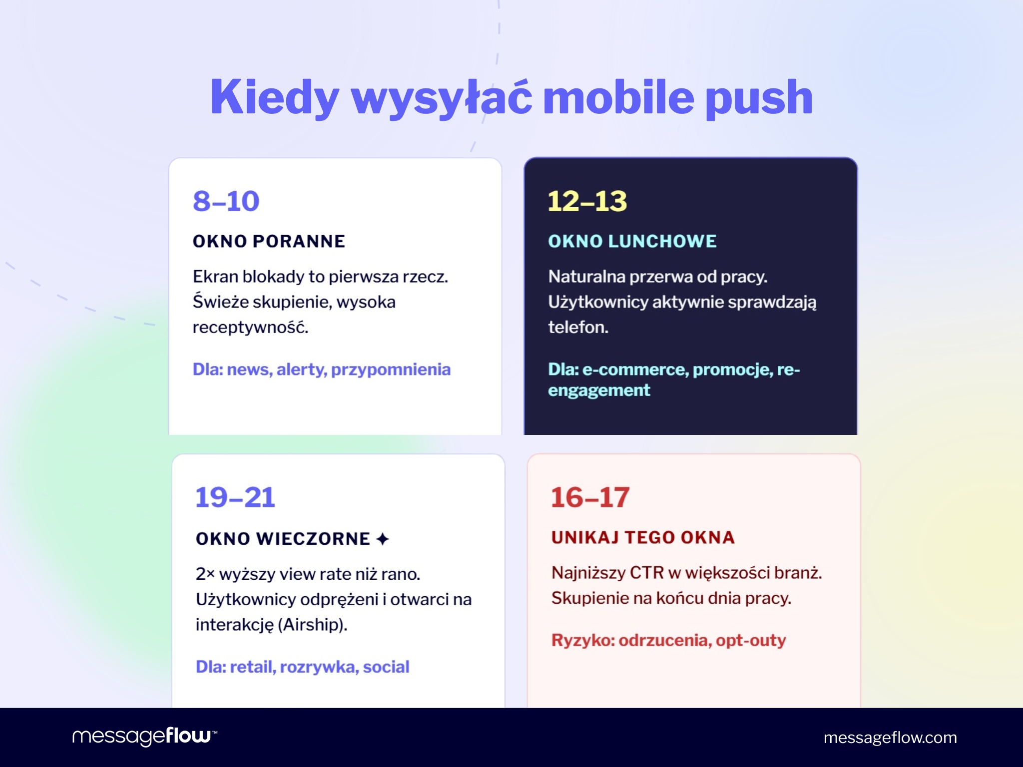 Wieczór: 19–21 (wydłużony do 23) Wieczorne kampanie push osiągają 2-krotnie wyższy view rate niż poranne (Airship, CleverTap). Użytkownicy są odprężeni i chętniej wchodzą w interakcje. Wieczór to najsilniejsze okno dla re-engagementu i push promocyjnego, szczególnie w retailu i rozrywce.